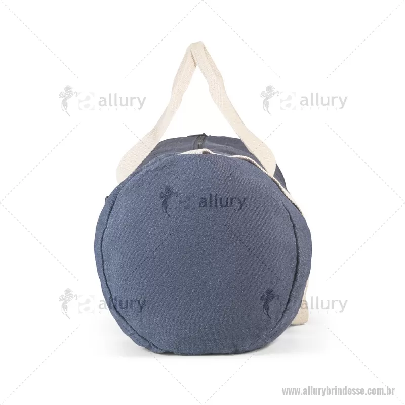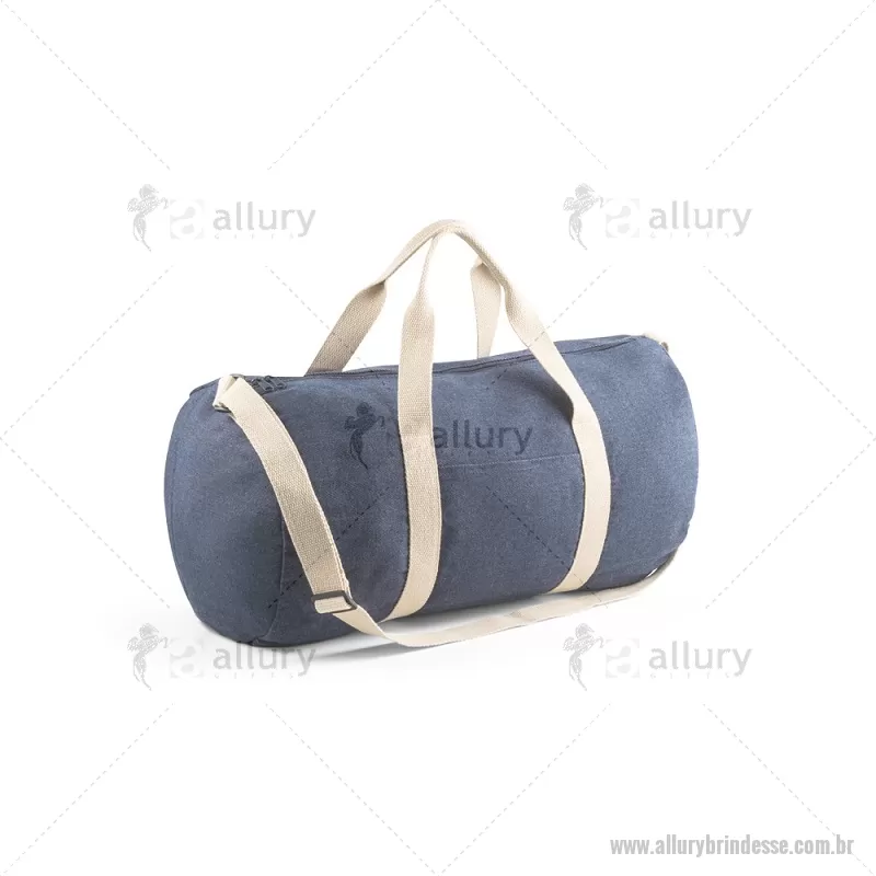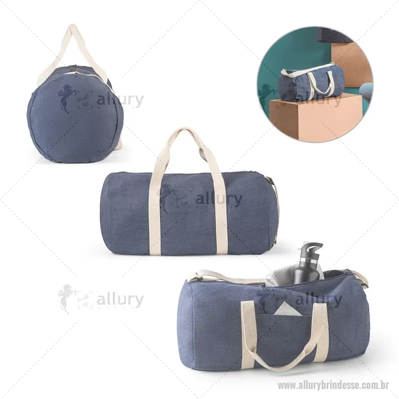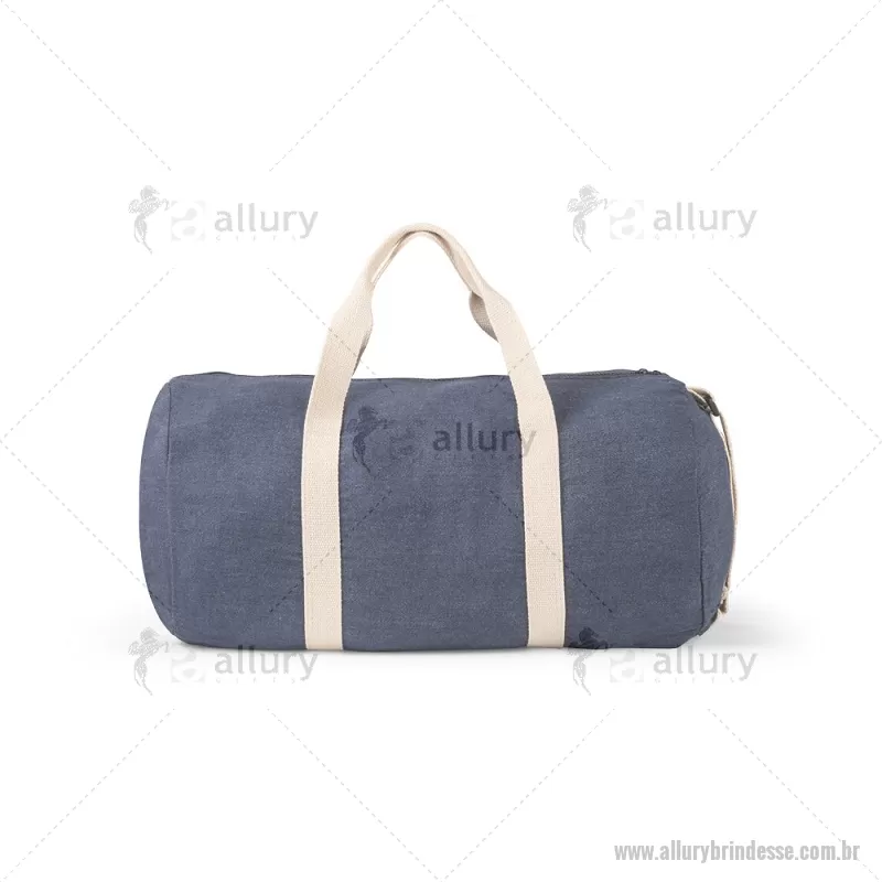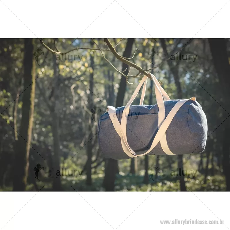 Bolsa esportiva ou viagem em denim reciclado (300 g/m²) Sacola esportiva ou viagem em denim reciclado (300 g/m²). Contém bolso frontal, fecho duplo e costuras reforçadas. Possui alças em webbing de algodão e alça de ombro ajustável até 130cm. Capacidade até 25 L. Ø260 x 480 mm Peso do Produto (g.): 249 - - ALLSEBOL043